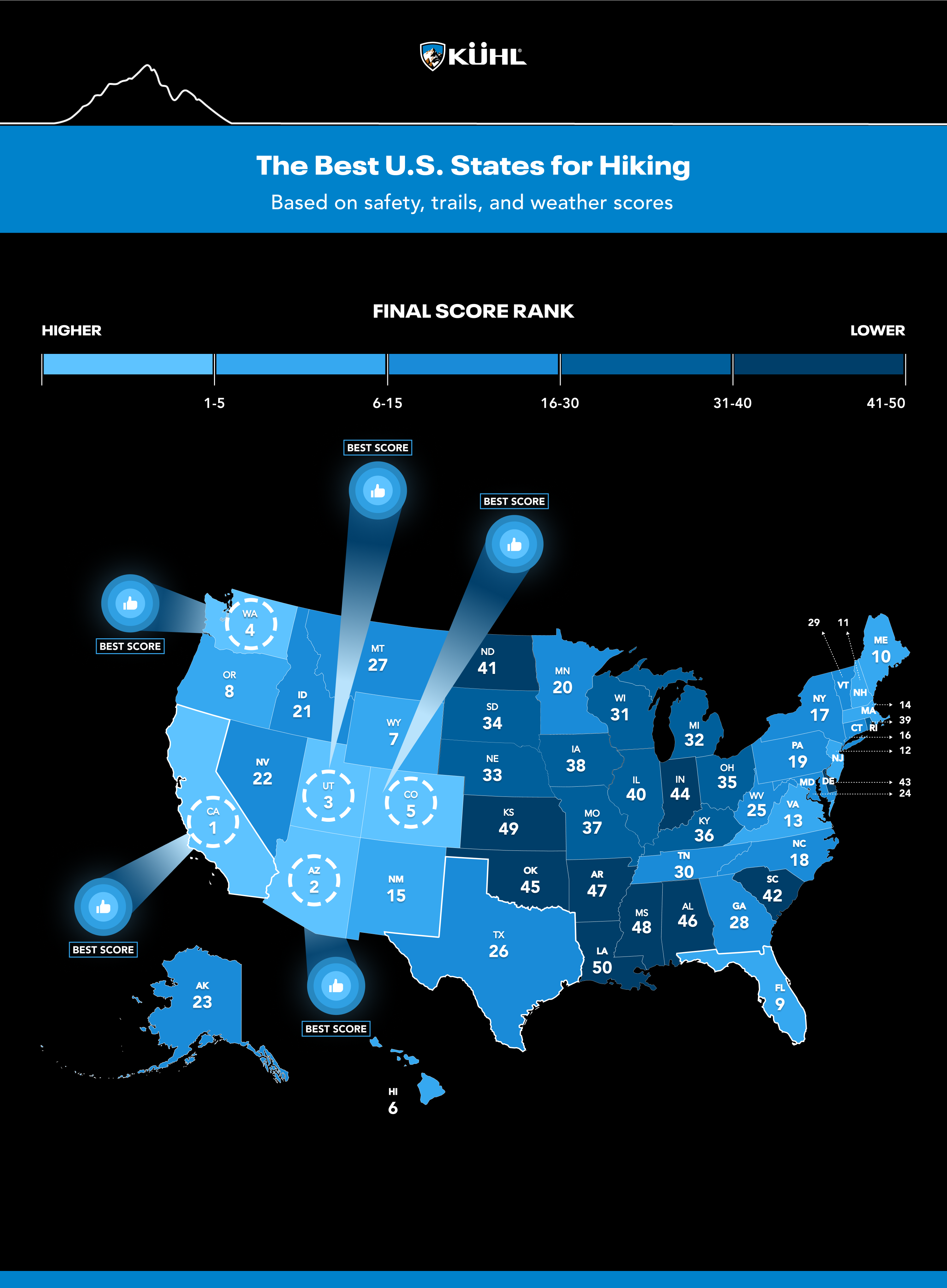 - California leads the pack: Scoring #1 overall, California earned top marks for trail access. Despite a relatively low safety ranking, The Golden State has a great weather score and more hiking trails and state parks than any other state.